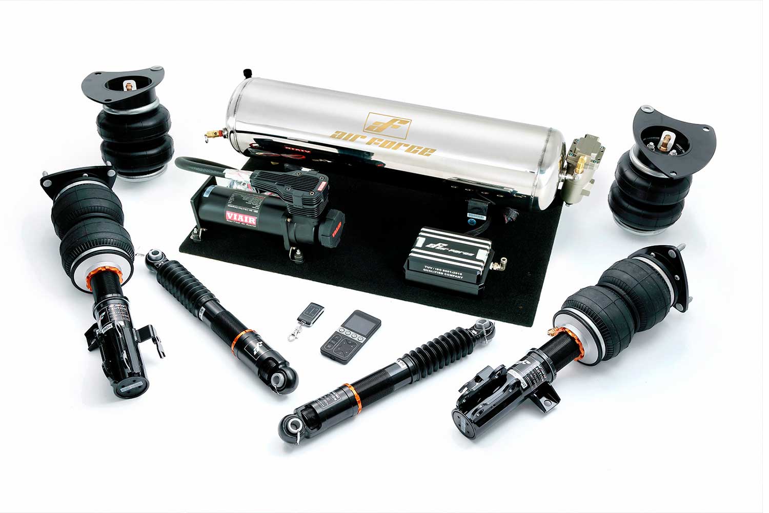 進化し続ける、次世代エアサスブランド。 1000以上の対応車種毎に専用設計されたボルトオンエアサス。 操作はすべてワイヤレスリモコン。お好みの車高へボタンひとつでセット。 積み重ねた技術力があるからこそできる、脚もシステムも完全オリジナル設計。 AirForce Suspensionは、世界基準のグローバルブランドです。