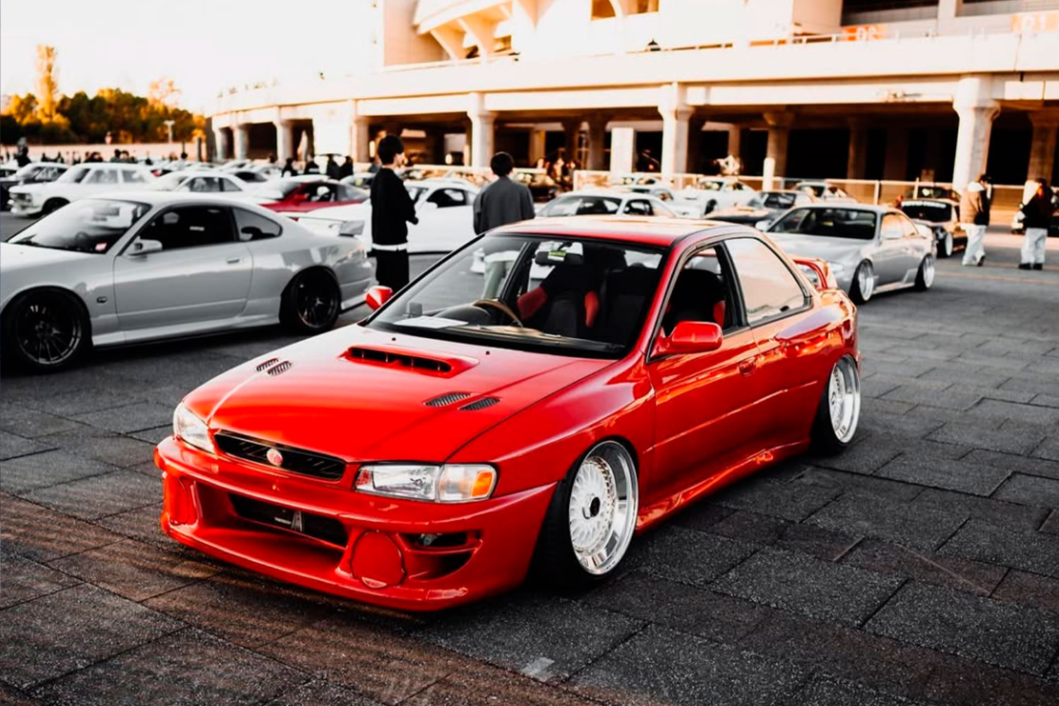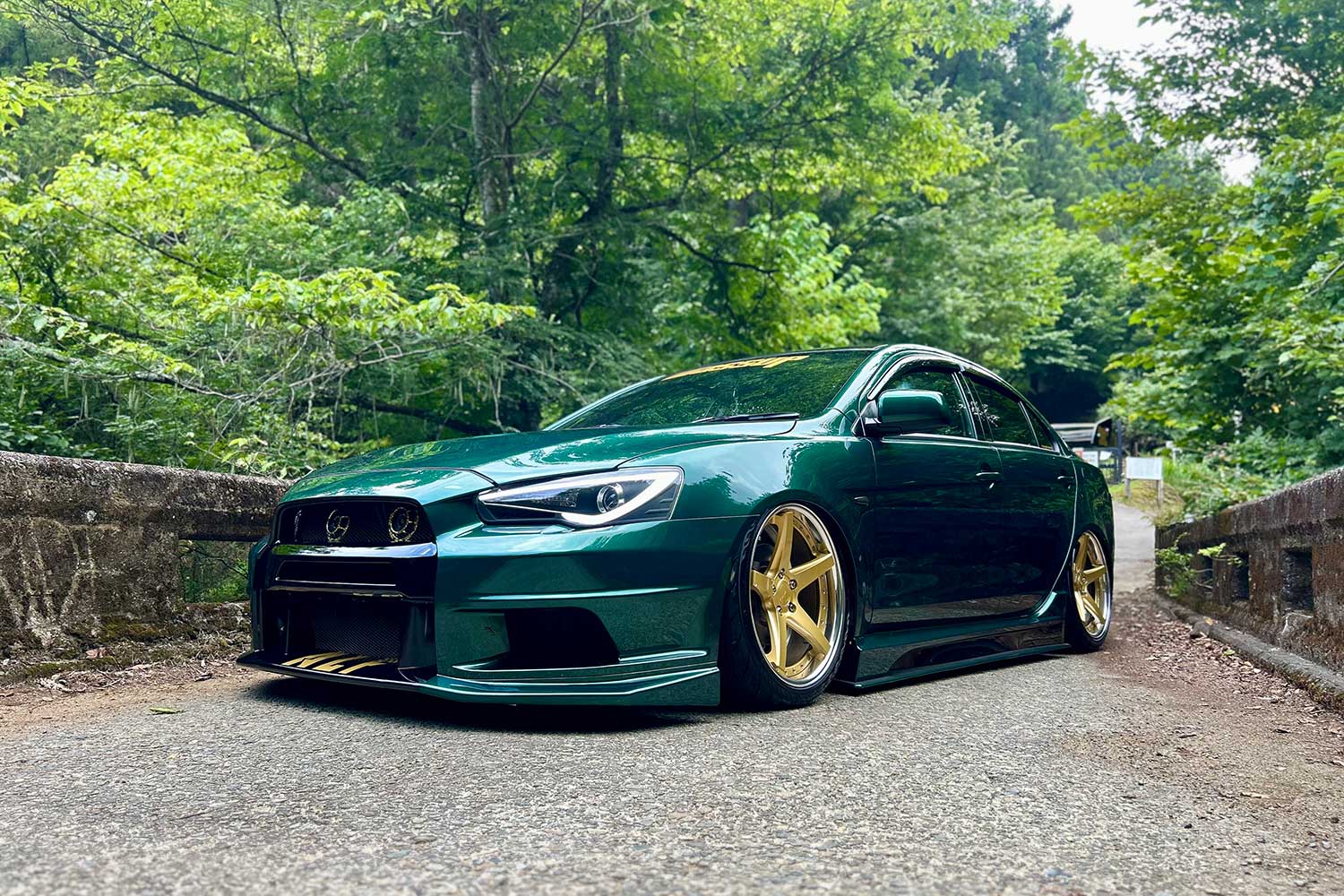 カスタムカラー全塗装車でスムージング等、多数ボディ加工点あります。エアサス組んであるのですが、メーカーワンオフでストラットを作っていただいて、同じ車種に同じエアサスを装着したものよりも下がるようになっています。現状そのまま車検に通るように車を使ったのもポイントです。