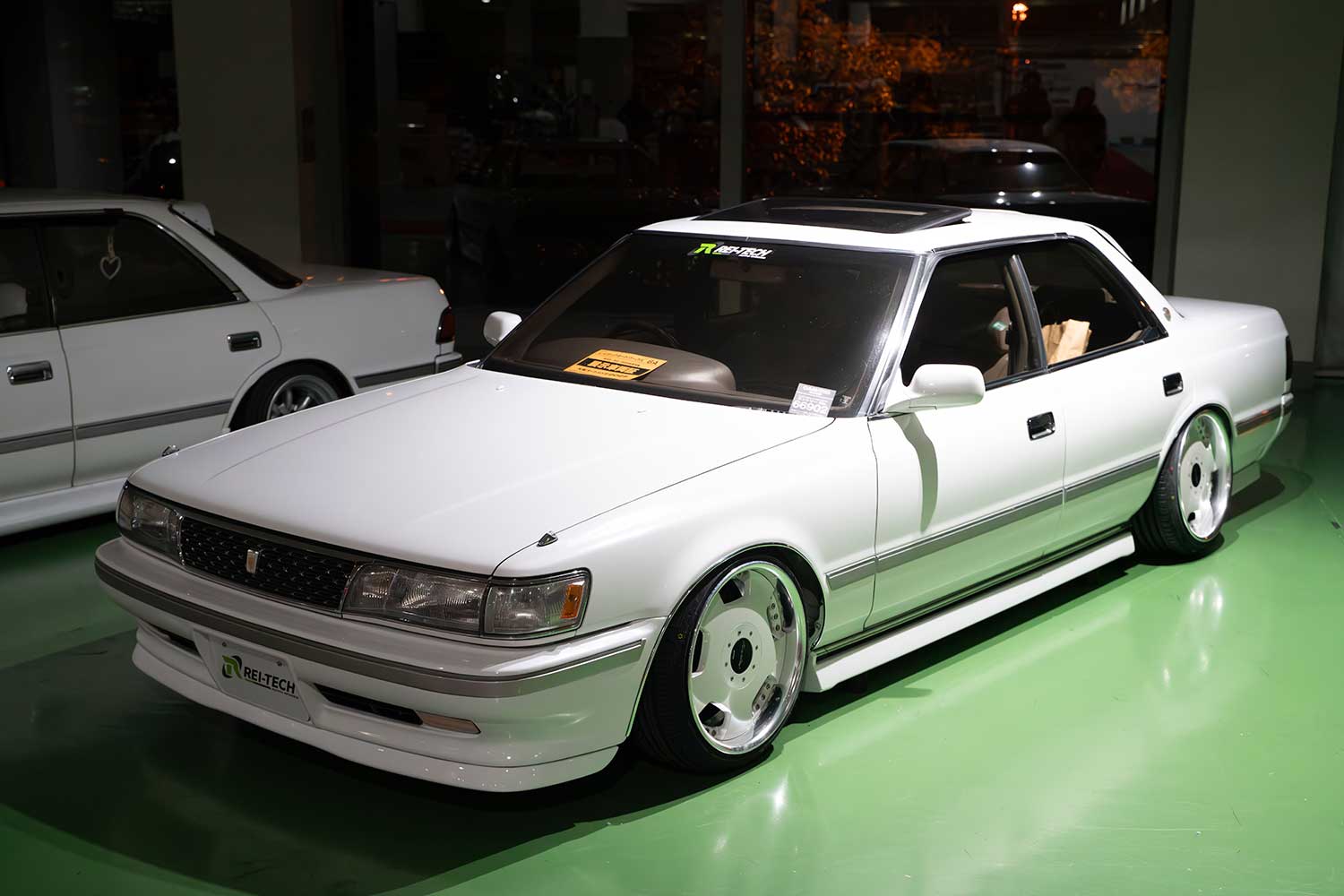 デモ車両弊社代表である、ゆっきー社長の愛車 81 マーク2。「当時の純正オプションエアロの設定があったら」をコンセプトに開発されたレイテックオートワークスオリジナルエアロ、オリジナル車高調、オリジナルアームを装着しています。エアロはマーク2 チェイサー クレスタ、ロング/ショートと以外にも81系は細かい設定があるのですが「自分が欲しい」を源動力に全て製作中。その変態ぶりは現地で御覧ください。