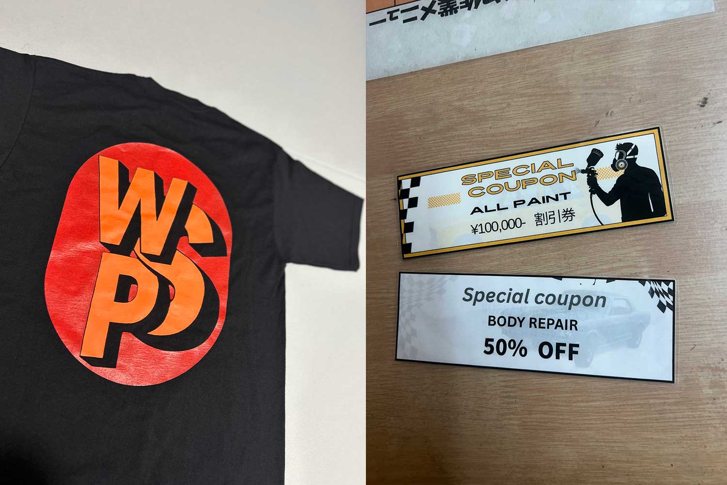 セール・プレゼント情報アパレル・グッズ、雑貨のガラポンくじ(1回¥500)をやるのですが、1等はオールペン10万円割引チケット、2等は鈑金塗装・パーツ塗装等の50%オフチケットと鈑金塗装屋ならではの景品もご用意させていただいております。